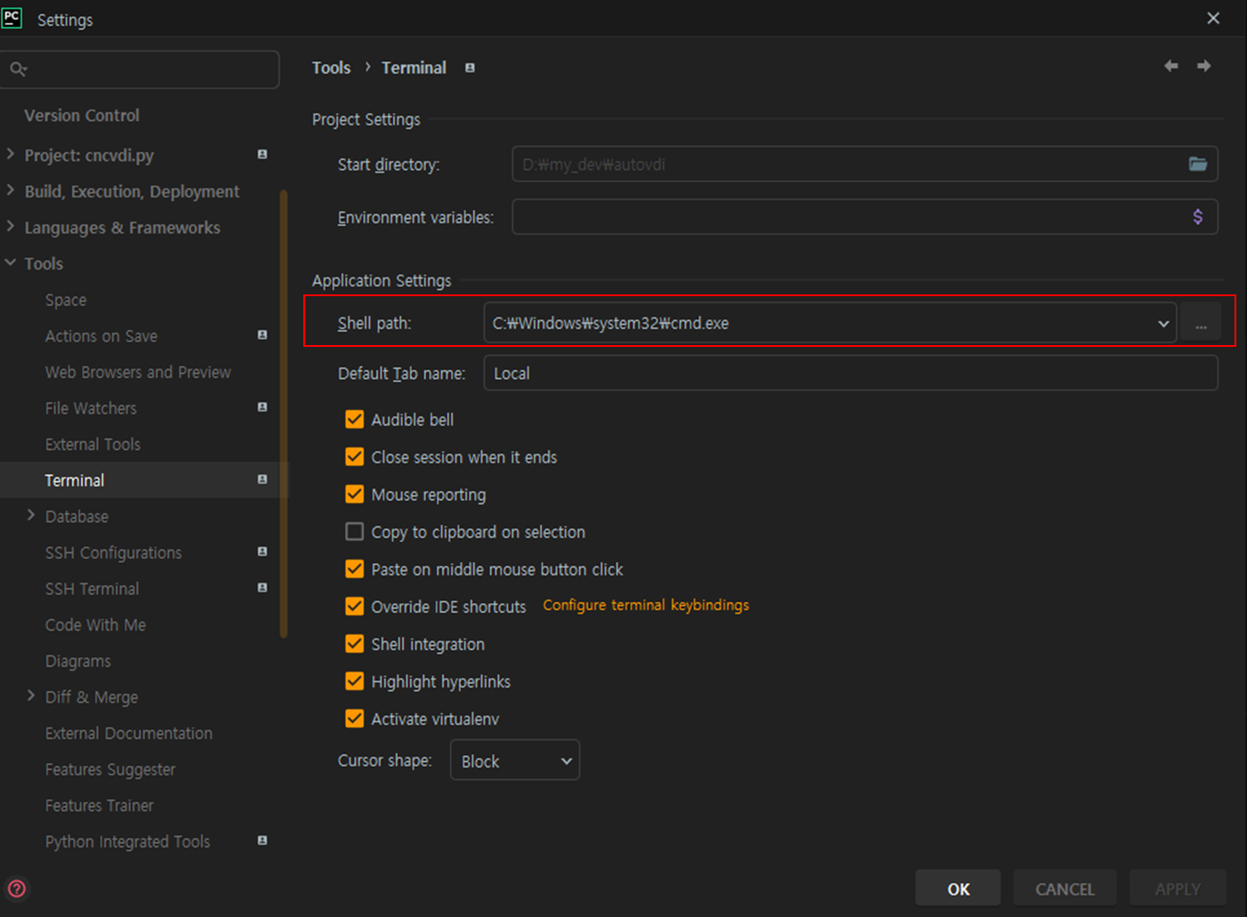 Shell Path 에서 콤보 버튼 눌러서 "cmd.exe" 선택