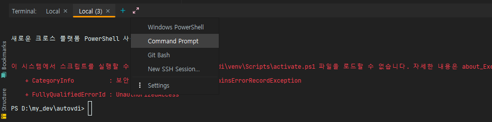 방법 1) Terminal 탭을 추가로 띄우면서, Command Prompt 선택