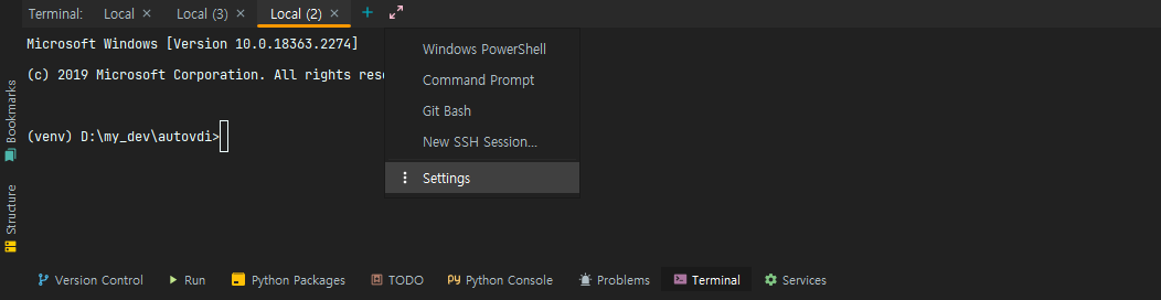 + 버튼 옆 확장 모양( / ) 버튼을 클릭하여 "Settings" 선택